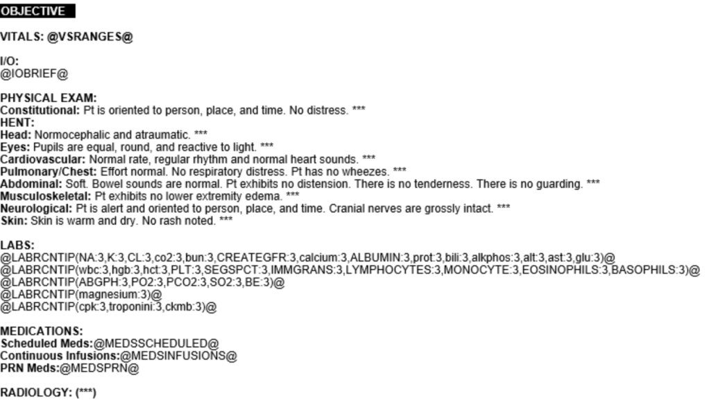 The program I use is EPIC. This is more or less how a template will appear. The *** means you cannot sign your note unless you address that section.